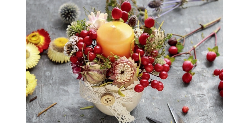 Finalnie część drobnych elementów roślinnych możemy dokleić również do samej świecy. Jesienny bukiet warto wzbogacić także o dodatki pasmanteryjne: ozdobne wstążki i taśmy.
