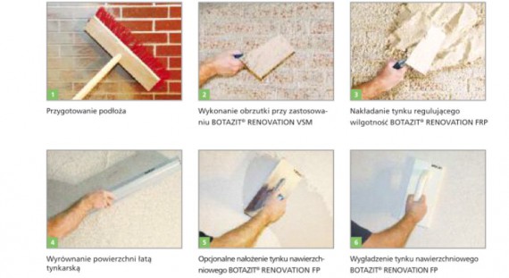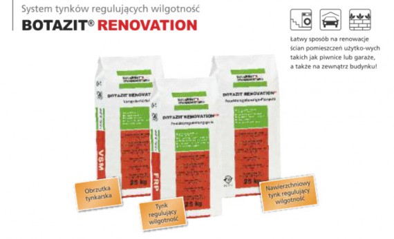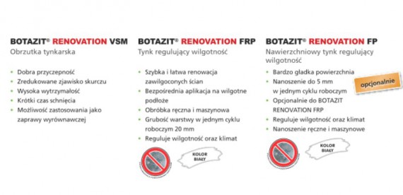 System tynków regulujących wilgotność BOTAZIT ® RENOVATION FRP znajduje zastosowanie przy renowacji zawilgoconych murów. Właściwości systemu, dzięki szczególnej geometrii porów, umożliwiają odparowanie wody na powierzchni tynku, a także transport soli aż do powierzchni tynku, nie blokując przy tym kapilar (stąd nie mamy tu do czynienia z tzw. tynkiem traconym). W przypadku bardzo wysokiego obciążenia solami, mogące pojawić się wykwity solne można łatwo usunąć miotłą lub odkurzaczem. Ponadto tynk regulujący wilgotność BOTAZIT ® RENOVATION FRP może pochłaniać nadmiar wilgoci zawartej w powietrzu, która w momencie wietrzenia pomieszczenia będzie z powrotem oddana.